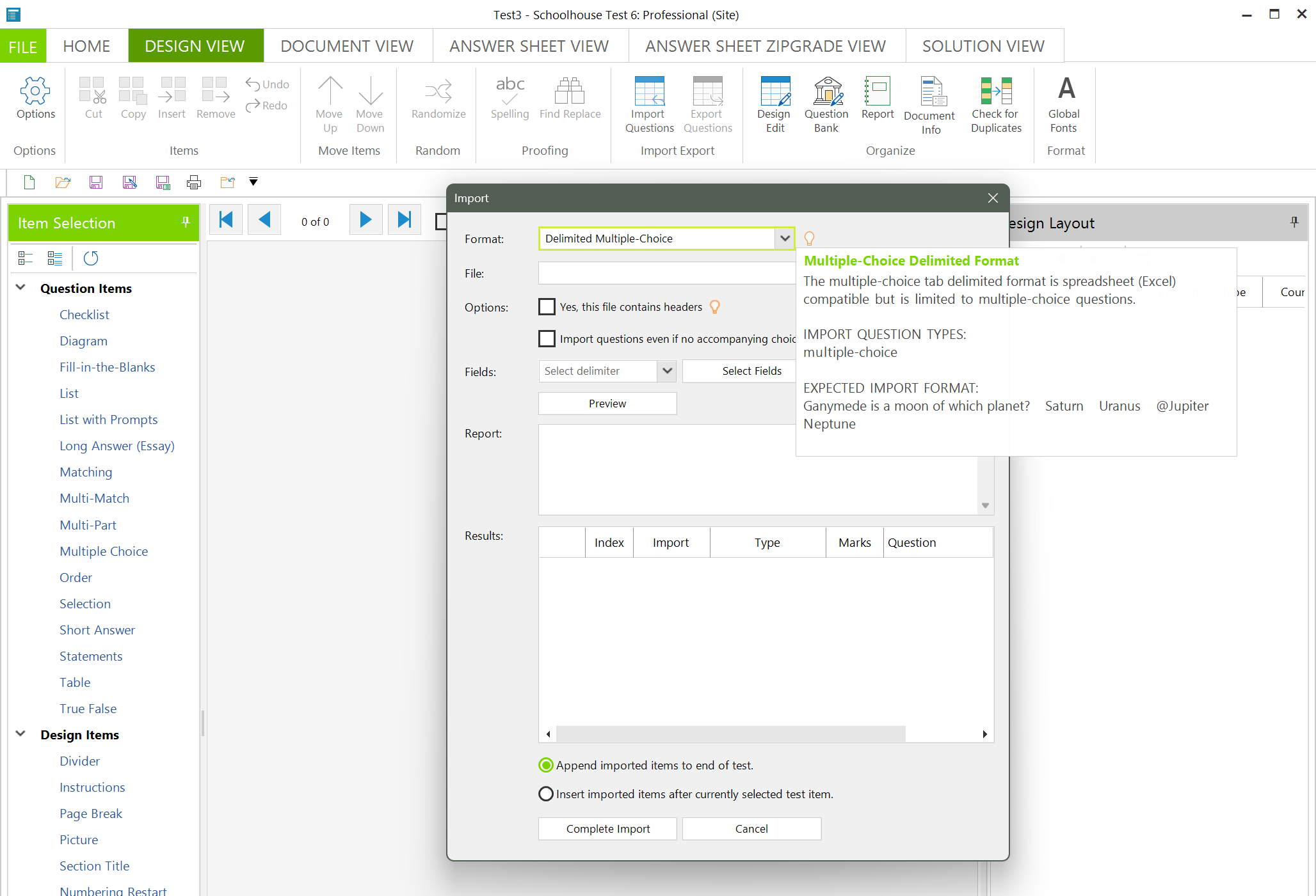 The multiple choice question text must be saved as a delimited text file (.txt) before it can be imported to Schoolhouse Test. Only the text data is imported; all special formatting and images are lost when the text data is exported from the original source as a delimited text file.