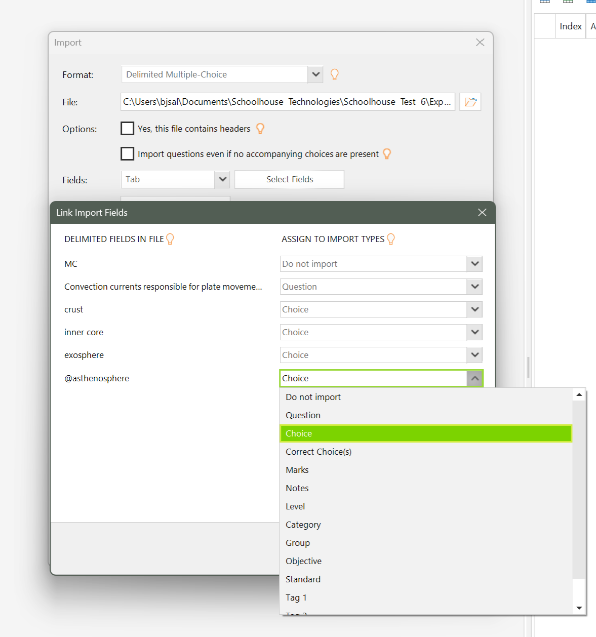 Once the delimited text file (.txt) is setup in the correct format, you can follow along the importing process; check the help icons - ? - for short explanations of key options in the process. On the Link Import Fields screen you will link the data the program has identified with the data fields each matches. Notes and other References/tags can be imported along with the actual questions and choices text.