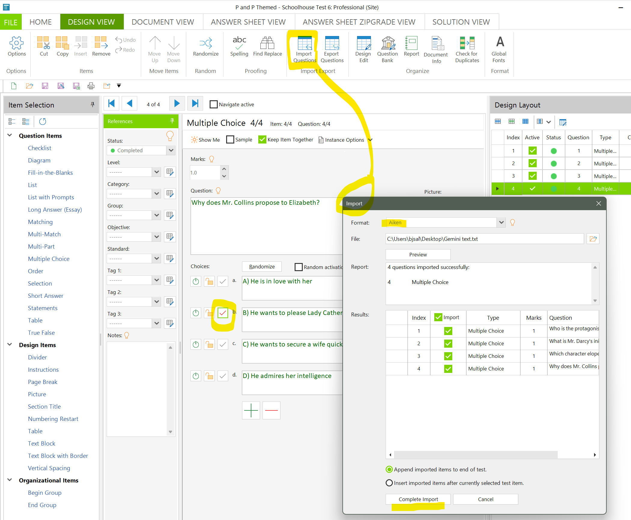 - With the Aiken formatted questions saved as a text file, I was ready to import the questions into Schoolhouse Test. In the picture below you can see the Import window plus the imported question data; I imported the data and then re-opened the Import window so you can see the options I selected. With my data imported to Schoolhouse Test I saved the test file and then carried on with additional editing to create my test ready for printing.