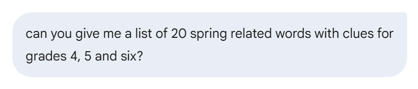 With some AI help and Vocabulary Worksheet Factory, I was able to easily create a spring-themed word list. With that word list, I was able to quickly create a document with a study sheet, word search, crossword and jumbles activity.