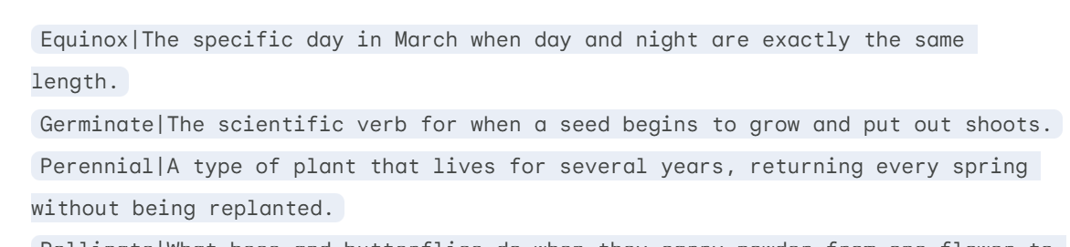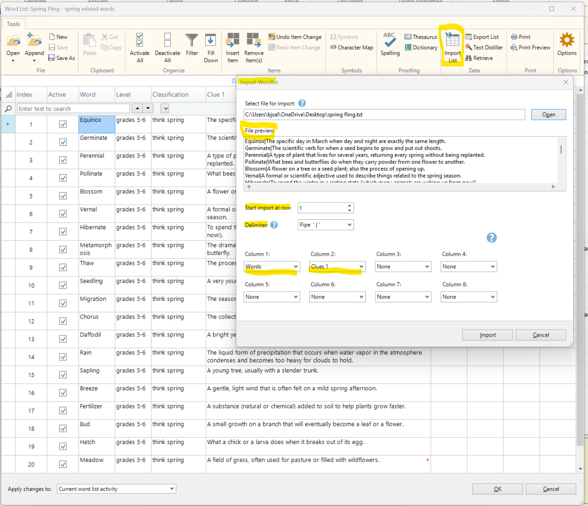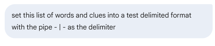 Once the word list appeared, I asked the AI tool to format the words and clues to delimited text format using the Pipe - | - so it could be imported to the Vocabulary program: