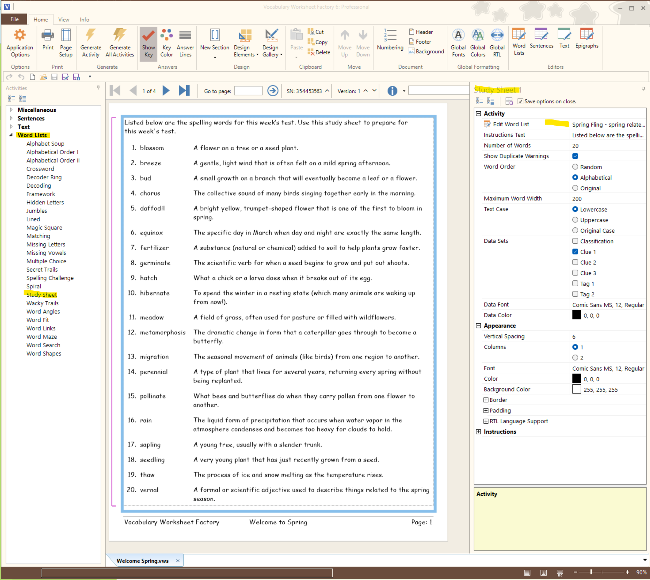 I saved the spring-themed word list, closed the Word List editor, and quickly created a four page Vocabulary document with a Study Sheet, Word Search, Crossword and Jumbles activity.